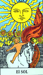 Este arcano representa la protección feliz; la dicha en este mundo, la felicidad de vivir, de sentir paz y alegría; que sólo alcanzan unos pocos, aún sabiendo que no es para siempre. El sol brilla en mitad del cielo y nos baña con la luz escénica de la claridad y de la conciencia más absoluta. En esta danza de la naturaleza, la libre relación de compañerismo entre hombre y mujer hacen posible que hasta las situaciones más comprometidas se expresen con optimismo y entusiasmo. Toda la energía puede dedicarse ahora a seguir un camino creativo conjunto, en lugar de gastarse en luchas por el poder, celos y subterfugios. De la misma manera que el calor del sol produce una reacción química en el proceso de maduración de la fruta, algo nuevo y diferente madura en la naturaleza del hombre. El fénix se quema, pero de sus cenizas renace una nueva ave majestuosa que asciende hasta el cielo. La luz de la conciencia penetra y purifica todos los aspectos de nuestra existencia.